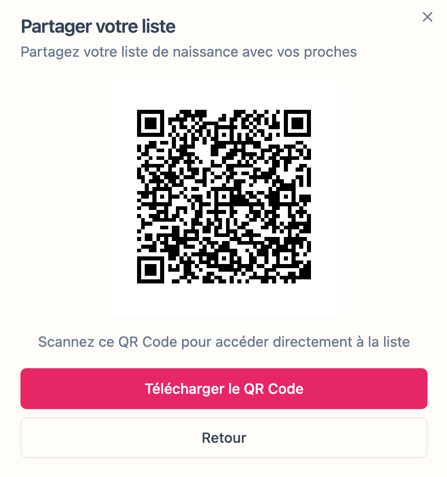 Si vous organisez une baby shower ou préparez votre faire-part de naissance, vous pouvez ajouter le lien ou un QR code menant vers votre liste Listéa. Il n’y a rien de plus simple !