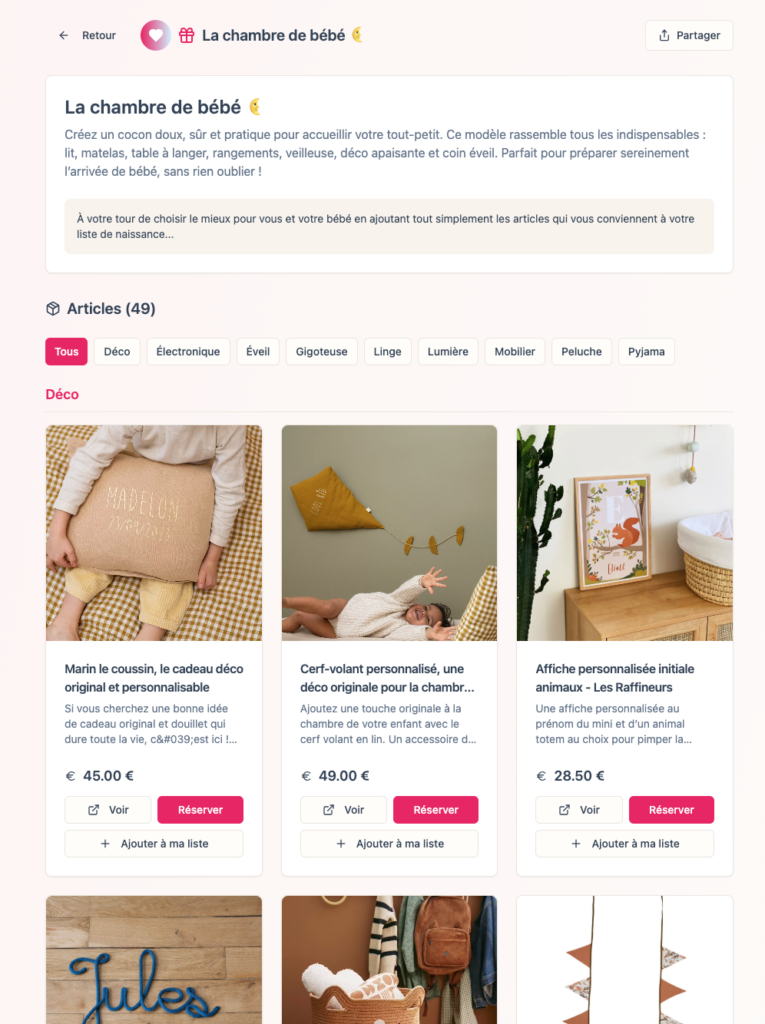 🎁 Besoin d’aide pour trouver les indispensables de la chambre de bébé comme une veilleuse, un thermomètre… une liste « La chambre de bébé » vous attend, il n’y a plus qu’à ajouter à votre liste de naissance, ou bien aller piocher sur vos enseignes préférées.